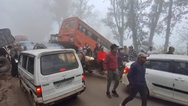 अलीगढ़–मथुरा राजमार्ग पर गंग नहर और गांव तेहरा के बीच मंगलवार सुबह घने कोहरे के चलते रोडवेज बस और सीमेंट से लदे ट्रेलर की टक्कर हो गई