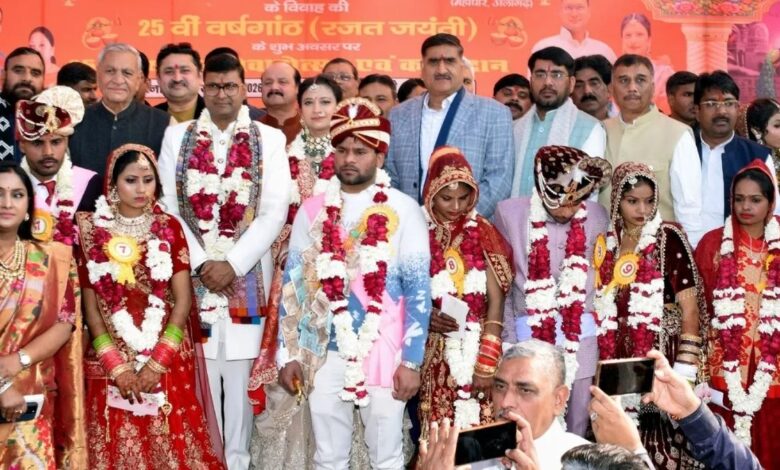 मेयर ने इसे समाज सेवा से जोड़ते हुए कमजोर वर्ग की बेटियों के विवाह में सहयोग को नैतिक दायित्व बताया। मुख्य अतिथि मंत्री चौधरी लक्ष्मी नारायण ने इस पहल की सराहना की।मेयर प्रशांत सिंघल व उनकी पत्नी पूजा सिंघल ने अपनी 25वीं वैवाहिक वर्षगांठ को यादगार बनाते हुए 25 बेटियों का सामूहिक विवाह कराकर सामाजिक सरोकार की मिसाल पेश की।कन्यादान से लेकर विवाह की सभी रस्म पूरे सम्मान व गरिमा के साथ कराई गईं। वर-वधू को आशीर्वाद देने के लिए शहर भर से बड़ी संख्या में लोग पहुंचे।