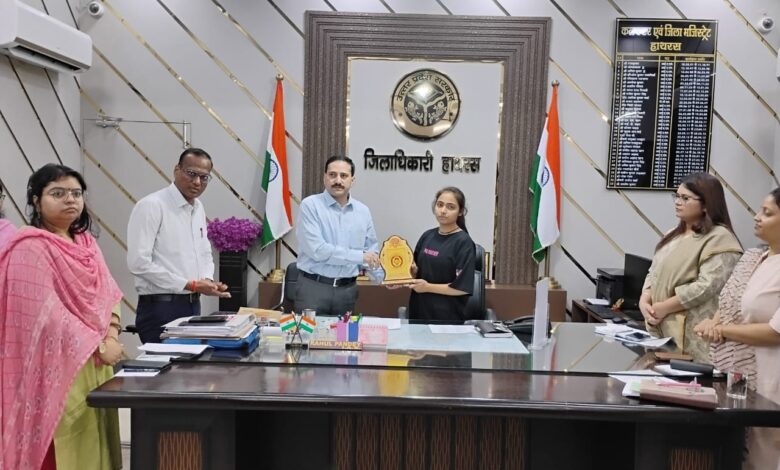 हाथरस। मिशन शक्ति फेज-5 के अंतर्गत महिला कल्याण विभाग द्वारा जनपद में ‘एक दिन की जिलाधिकारी – नायिका इवेंट’ का आयोजन किया गया। इस अवसर पर कक्षा 12 में जनपद स्तर पर सर्वाधिक अंक प्राप्त करने वाली छात्रा अंकिता कौशिक को एक दिन का जिलाधिकारी बनाया गया।कार्यक्रम में जिलाधिकारी राहुल पाण्डेय ने एक दिन की जिलाधिकारी को कलेक्ट्रेट के समस्त कार्यप्रणाली से अवगत कराया। उन्होंने उपस्थित अधिकारियों यथा अपर जिलाधिकारी (वित्त एवं राजस्व), प्रभारी अधिकारी कलेक्ट्रेट, जिला समाज कल्याण अधिकारी, एसीएमओ तथा जिला पंचायत राज अधिकारी — से उनके कार्यक्षेत्रों की जानकारी साझा की। एक दिन की जिलाधिकारी अंकिता कौशिक ने जनता दर्शन में लोगों की समस्याएं सुनीं और उनके त्वरित निस्तारण हेतु संबंधित अधिकारियों को निर्देश दिए।