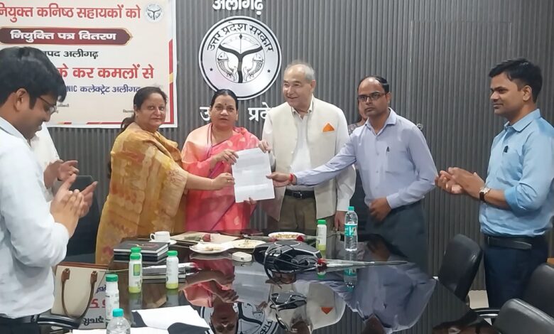 अलीगढ़ : मा0 मुख्यमंत्री श्री योगी आदित्यनाथ के नेतृत्व में युवाओं को रोजगार उपलब्ध कराने की पहल के तहत लखनऊ में कनिष्ठ लिपिकों एवं एक्स-रे टेक्नीशियनों को नियुक्ति पत्र वितरित किए गए। इसी क्रम में जिले के स्वास्थ्य विभाग के 10 कनिष्ठ लिपिकों को कलेक्ट्रेट स्थित एनआईसी में नियुक्ति पत्र प्रदान किए गए।कार्यक्रम की मुख्य अतिथि मा0 अध्यक्ष जिला पंचायत श्रीमती विजय सिंह, एमएलसी प्रो. तारिक मंसूर, आयुक्त अलीगढ़ मण्डल, अलीगढ़ श्रीमती संगीता सिंह एवं अपर जिलाधिकारी न्यायिक अखिलेश कुमार रहे। वक्ताओं ने कहा कि नवनियुक्त कर्मचारी स्वास्थ्य सेवाओं को सुदृढ़ बनाने में महत्वपूर्ण भूमिका निभाएँगे।इस अवसर पर सीएमओ डॉ. नीरज त्यागी व कार्यक्रम प्रभारी डॉ. राहुल शर्मा ने भी शुभकामनाएँ दीं। कार्यक्रम का संचालन जिला प्रशासनिक अधिकारी रोहित प्रकाश सक्सैना ने किया।
