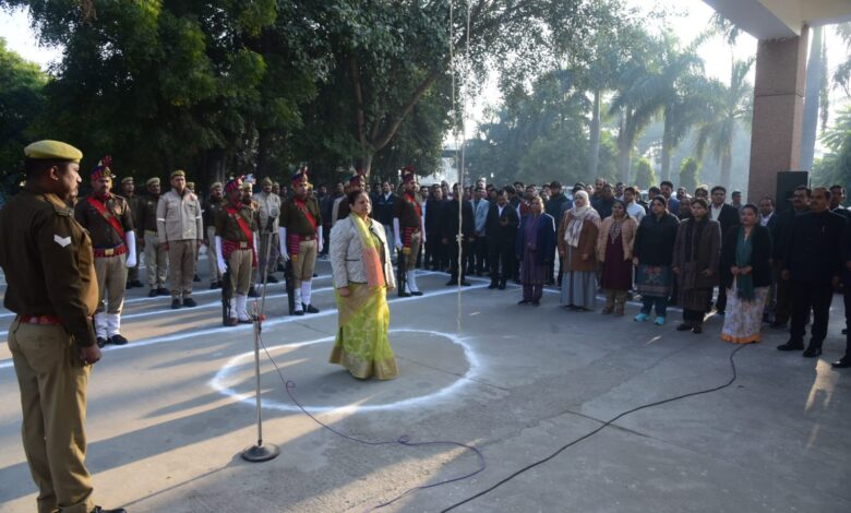 अलीगढ़ 77 वे गणतंत्र दिवस के अवसर पर आयुक्त, अलीगढ़ मण्डल, अलीगढ़ श्रीमती संगीता सिंह द्वारा कमिश्नरी के प्रांगण में ध्वजारोहण कर तिरंगे को सलामी दी। इसके पश्चात मण्डलायुक्त ने राष्ट्रगान कर संविधान की प्रस्तावना की उपस्थितजनों को शपथ दिलाई गयी। कमिश्नरी सभागार में आयोजित गणतंत्र दिवस समारोह में स्कूली बच्चों द्वारा देशभक्ति एवं राष्ट्रीय एकता की भावना से ओत-प्रोत सांस्कृतिक कार्यक्रमों की भावभीनी प्रस्तुति दी गई।मंडलायुक्त उपस्थिति सभी अधिकारियों एवं कर्मचारियों को गणतंत्र दिवस की शुभकामनाएं देते हुए सर्वप्रथम दाऊपुर के वीर सपूत मोनू चौधरी को नम आंखों से श्रद्धांजलि अर्पित करते हुए कहा कि हम सभी को यह कभी नहीं भूलना चाहिए कि हमारे वीर जवान सीमा पर देश और संविधान की रक्षा के लिए अपने प्राणों की आहुति देते हैं। सभी नागरिकों को अपने दायित्वों व कर्तव्यबोध के साथ ही संविधान में दिए नियमों का पालन करना चाहिए। उन्होंने कहा कि आज ही के दिन भारत गणराज्य का संविधान लागू हुआ था। आज हम संविधान के प्रति समर्पण भाव से देश की एकता, अखंडता एवं संप्रभुता को बनाए रखने का संकल्प लें और अपने कार्यों एवं आदतों से राष्ट्र निर्माण में अपना योगदान प्रदान करें।