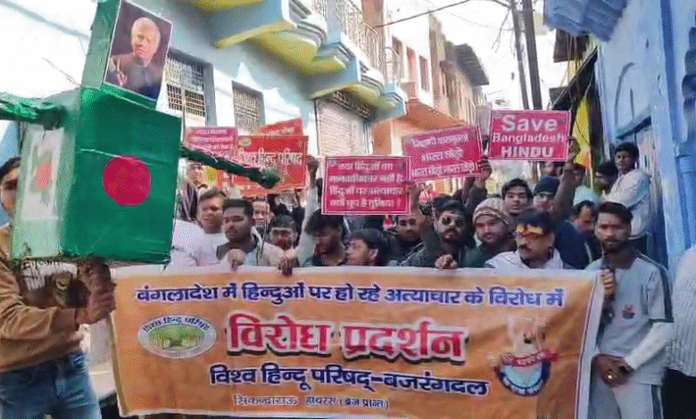 बांग्लादेश में अल्पसंख्यक हिंदुओं पर हो रहे कथित बर्बर हमलों और मयमनसिंह में युवक दीपू चंद्र दास की वीभत्स मॉब लिंचिंग के विरोध में गुरुवार को सिकंद्राराऊ में जोरदार प्रदर्शन किया गया