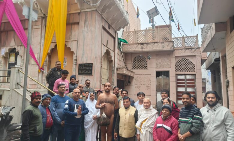 शुक्रवार को खिरनी गेट स्थित श्री लख्मीचंद पांड्या खंडेलवाल दिगंबर जैन ट्रस्ट परिसर में प्रथमबार जैन संत आचार्य श्री 108 नमोस्तु सागर जी मुनिराज का ससंघ मंगल प्रवेश हुआ। आचार्य श्री मथुरा से राया मुरसान ,हाथरस,सासनी से पद विहार करते हुए प्रात: अलीगढ़ पहुंचे। शिवा गेस्ट हाउस आगरा रोड पर एकत्रित जैन समाज ने आचार्य श्री अगवानी की एवं बैंड बाजे के साथ सासनी गेट होते हुए बाग वाले मंदिर जी में प्रवेश कराया। जगह जगह रास्ते में श्रावक श्राविकाओं ने अपने घरों के आगे आरती उतारकर आशीर्वाद प्राप्त किया।जहां मंदिर के मंत्री विजय कुमार जैन ने आचार्य श्री का पाद प्रक्षालन,आरती उतार कर अगवानी की। राजीव जैन ने बताया कि कड़कड़ाती सर्दी और कोहरे में जैन संत का पद विहार उनकी कठोर तपस्या और संयम का प्रतीक है,जहां वह दिगम्बर मुद्रा (बिना वस्त्र) में कड़ाके की ठंड में भी पैदल यात्रा करते है क्योंकि सर्दी गर्मी को वे परिषय मानकर सहन करते है जैन संत हमेशा पैदल चलते है और किसी भी भौतिक सुख सुविधा का त्याग करते है जिससे उनका मन और शरीर कठोर साधना के लिए तैयार होता है। मीडिया प्रभारी मयंक जैन ने बताया कि आचार्य श्री का कुछ समय के लिए अलीगढ़ में प्रवास रहेगा एवं उनके सानिध्य में धार्मिक आयोजन सम्पन्न होंगे। इस मौके पर रविन्द्र जैन, सुरेश कुमार जैन गढ़ी,अनिल जैन श्रीजी,हरिकांत जैन,मुकेश जैन,प्रदीप जैन,हेमंत जैन,विनय जैन,पंकज जैन,प्रकाश जैन,संजय जैन ,सतेंद्र जैन,दीपेंद्र जैन,कुणाल जैन,लक्ष्य जैन,सत्यम जैन,ऋषभ जैन,दक्ष जैन,समाज के महिला पुरुष बच्चे उपस्थित रहे।