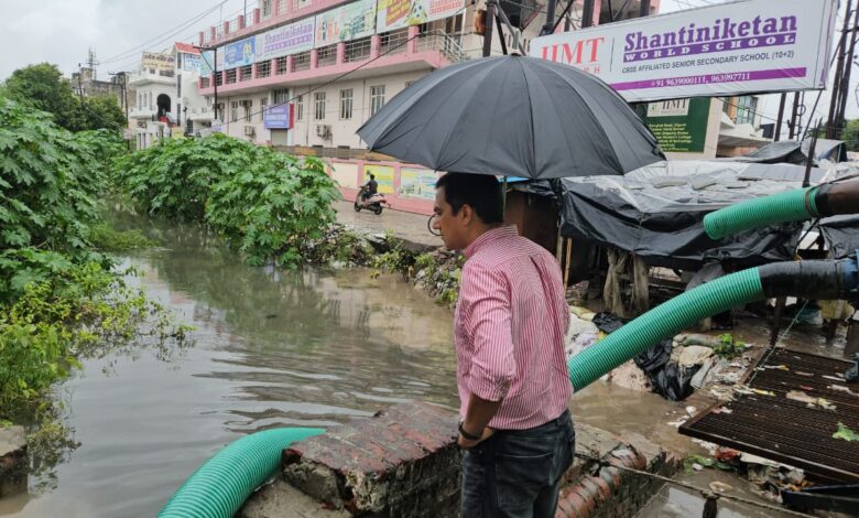 भारी बारिश को देखते हुए नगर आयुक्त ने खोदे गए गड्ढों को बंद करने, एकसार करने निर्माणाधीन स्थल के पास बैरिकेट्स सेफ्टी बैरियर व साइन बोर्ड लगाए जाने निर्माणाधीन स्थलों पर पब्लिक को अवेयर करने सुरक्षा संबंधी बोर्ड लगाने के निर्देश दिए।अधिनस्थों को हिदायतनगर आयुक्त ने सभी अधीनस्थों को जलभराव वाले स्थल, पम्पिंग स्टेशन का निरीक्षण कर वहां पर अतिरिक्त पंप सेट लगाने के साथ-साथ नालों व उन पर लगी जालियों की सफाई के लिए अतिरिक्त कर्मचारियों को तैनात करने की हिदायत दी।नगर आयुक्त ने कहा कई एरिया में जल भराव व लोगो के रहने की परेशानी को देखते हुए नगर निगम के गांधी पार्क शेल्टर होम व भुजपुरा शेल्टर होम को राहत शिविर में तब्दील कर दिया गया है लोग वहाँ विश्राम कर सकते है।नगर आयुक्त ने बताया लगातार बारिश में जल भराव की समस्या से निपटने के लिए राउंड द क्लॉक नगर निगम फील्ड में उतरकर काम कर रहा है जल भराव वाले क्षेत्रों में जल निकासी के उपरांत युद्ध स्तर पर सफ़ाई व्यवस्था कराना प्राथमिकता होगी.
