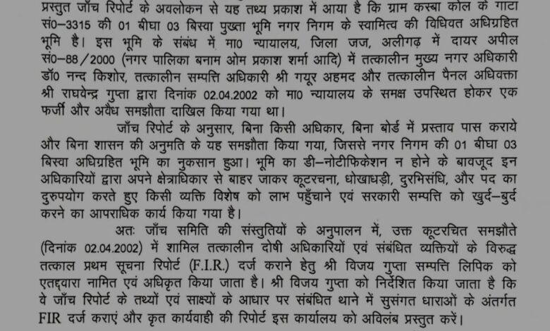 सहायक नगर आयुक्त ने बताया कि जांच में पाया गया कि उपरोक्त अधिकारियों द्वारा दिनांक 02.04.2002 को न्यायालय में प्रस्तुत समझौते के माध्यम से नगर निगम की अधिग्रहित भूमि के एक हिस्से को वादिनी पक्ष के हित में छोड़ा गया तथा बदले में अन्य भूखंड से मार्ग देने जैसी व्यवस्था दर्शाई गई। यह कार्रवाई न तो नगर निगम बोर्ड की स्वीकृति से की गई थी और न ही शासन की अनुमति प्राप्त थी। आरोप है कि उक्त समझौते के माध्यम से सरकारी भूमि के स्वामित्व, उपयोग एवं सार्वजनिक हित को प्रभावित किया गया, जिससे नगर निगम को भारी वित्तीय एवं संपत्ति संबंधी क्षति पहुँची। समिति के अनुसार, भूमि अधिग्रहण की वैधानिक प्रक्रिया के अंतर्गत जारी शासनादेशों के रहते किसी भी अधिकारी को एकतरफा समझौता करने का अधिकार नहीं था।