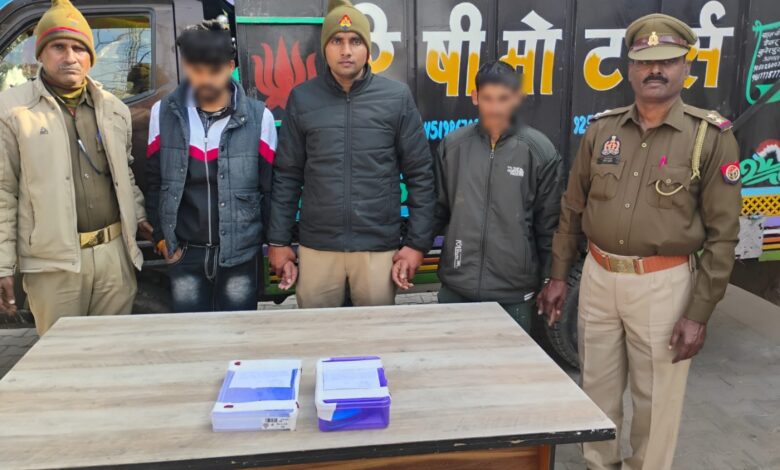 हाथरस। लतीफ खां पुत्र बहादुर खां निवासी गुतहरी थाना सहपऊ द्वारा थाना सहपऊ पर सूचना दी कि दिनांक 13/14.12.2025 की रात्रि में वादी के घेर से दिवार काटकर भेड व बकरियां अज्ञात चोर द्वारा चोरी कर ले गये है । वादी की प्राप्त लिखित तहरीर के आधार पर थाना सहपऊ पर सुसंगत धाराओं में अभियोग पंजीकृत किया गया । पुलिस अधीक्षक चिरंजीव नाथ सिन्हा द्वारा घटना का शीघ्र अनावरण करते हुए घटना में शामिल अभियुक्तों की गिरफ्तारी व माल बरामदगी के सम्बन्ध में अपर पुलिस के निर्देशन में क्षेत्राधिकारी सादाबाद के नेतृत्व में थाना प्रभारी सहपऊ को निर्देशित किया गया । जिसके क्रम में 23.12.2025 को थाना सहपऊ पुलिस द्वारा कार्यवाही करते हुए बकरी चोरी की घटना का सफल अनावरण करते हुए घटना कारित करने वाले दो शातिर चोरों को महरारा चौराहे के पास सादाबाद जलेसर रोड से गिरफ्तार किया गया है । जिनके नाम रिषी कुमार दिवाकर पुत्र पप्पू सिंह निवासी शान्ति नगर थाना रसूलपुर जिला फिरोजाबाद, राजा पुत्र महावीर सिंह निवासी जौधरी थाना नारखी जिला फिरोजाबाद है।जिनके कब्जे से चोरी की हुई आठ भेड व एक बकरी , घटना मे प्रयुक्त TATA INTRA V 20 गोल्ड CNG न0 UP83 DT 8543 ,दो तमंचे 315 बोर व चार जिन्दा कारतूस 315 बोर बरामद हुए है । अभियुक्तगण की गिरफ्तारी एवं बरामदगी के सम्बन्ध मे थाना सहपऊ पुलिस द्वारा आवश्यक विधिक कार्यवाही की जा रही है । गिरफ्तार अभियुक्तगण द्वारा अपने जुर्म का इकबाल करते हुए बताया कि उनके द्वारा योजनाबन्ध तरीके से 13/14.12.2025 की रात में गांव गुतहरा से कुछ भेड व बकरिया चोरी की थी तथा हम लोगों ने इस चोरी से करीब 05-06 दिन पूर्व मिसौली जलेसर में भी बकरियाँ चोरी की थीं। हम लोग इसी गाडी में भेड बकरियों को भरकर गांव सिखरा से रुपधनु आंवलखेडा होते हुये टोल प्लाजा टूण्डला गुजरते हुये फिरोजाबाद ले गये । तथा वहाँ से घने कोहरे को देखते कुछ भेड व बकरियों को गाडी में भरकर मथुरा की पशु पैठ में बेचने जा रहे थे । गिरफ्तारी करने वाली पुलिस टीम के नाम थाना प्रभारी मयंक चौधरी मय टीम थाना सहपऊ जनपद हाथरस है।