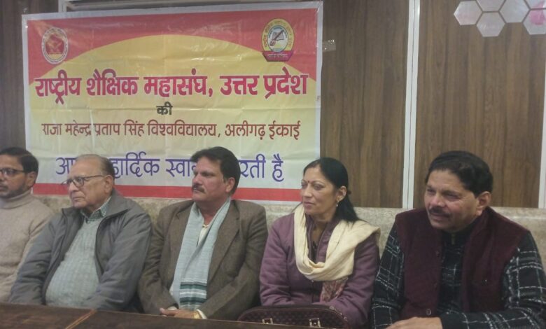 राष्ट्रीय शैक्षिक महासंघ राजा महेंद्र प्रताप सिंह विश्वविद्यालय अलीगढ़ इकाई द्वारा किया गया पत्रकार वार्ता का आयोजन