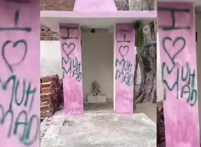 अलीगढ़ के लोधा थाना क्षेत्र के दो गांव के पांच मंदिरों पर किसी ने आई लव मोहम्मद लिख दिया