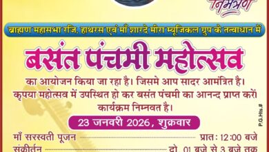 हाथरस। ब्राह्मण महासभा रजिस्टर्ड हाथरस एवं मां शारदे मीरा म्यूजिकल ग्रुप के संरक्षण में, विप्र महिला महासभा हाथरस के तत्वावधान…