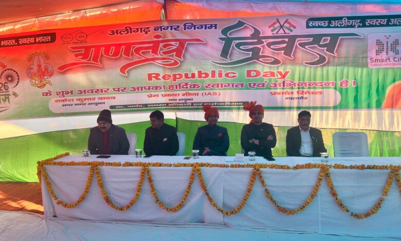 संविधान की शपथ दिलाते हुए अधिकारी और कर्मचारियों को टीम भावना के साथ एकजुट होकर कार्य करने का किया आह्वानमहापुरुषों को किया गया याद-स्वतंत्रता संग्राम सेनानियों की प्रतिमाओं पर किया माल्यार्पण-स्वतंत्रता संग्राम सेनानियों के परिजनों व उत्कृष्ट कार्य करने वाले अधिकारी कर्मचारी सफाई कर्मचारी को किया गया सम्मानित77 वां गणतंत्र दिवस और उत्तर प्रदेश स्थापना दिवस नगर निगम अलीगढ़ में महापौर प्रशान्त सिंघल व नगर आयुक्त प्रेम प्रकाश मीणा के नेतृत्व में बड़ी धूमधाम से मनाया गया।गणतंत्र दिवस की पूर्व संध्या पर दुल्हन की तरह नगर निगम सेवा भवन सहित प्रमुख चौराहों, महापुरुषों की प्रतिमाओं को रंग बिरंगी रोशनी से सजाया गया तो वही परंपरागत गणतंत्र दिवस के अवसर पर सुबह 7:00 से 8:00 के बीच नगरीय क्षेत्र में महापुरुषों की प्रतिमाओं पर निगम अधिकारियों ने जनप्रतिनिधियों की गरिमामय उपस्थिति में माल्यार्पण किया गया।महापौर और नगर आयुक्त ने पार्षदों/अधिकारी व कर्मचारियों की मौजूदगी में संयुक्त रूप से सेवाभवन में तिरंगा फहराया और संविधान के प्रति निष्ठावान रहने का संकल्प दिलाया। नगर निगम सेवाभवन में भगवान बाल्मीकि जी की प्रतिमा पर माल्यार्पण करते हुए आयोजित सांस्कतिक कार्यक्रम में महापौर, नगर आयुक्त, पार्षदो सहित अधिकारी कर्मचारियों ने भारत के संविधान और आज़ादी के अमर वीर सपूतों के जीवन पर प्रकाश डाला।भव्य सांस्कृतिक कार्यक्रम में स्वतंत्रता संग्राम सेनानियों के परिजनों को महापौर नगर आयुक्त और अपर नगर आयुक्त राकेश कुमार यादव के साथ पार्षदों ने संयुक्त रूप से शॉल उड़ाकर माला पहनाकर सम्मानित किया वही बच्चों की हौसला अफजाई करते हुए उन्हें पुरस्कार देकर सम्मानित किया। कार्यक्रम में महापौर, नगर आयुक्त व पार्षदों ने नगर निगम के विभिन्न विभाग में कार्यरत अधिकारी व कर्मचारियों, सफ़ाई कर्मचारियों को उत्कृष्ट कार्य के लिए सम्मानित किया गया।नगर आयुक्त प्रेम प्रकाश मीणा ने गणतंत्र दिवस के अवसर पर संविधान निर्माण में महापुरुषों के योगदान पर प्रकाश ने पिछले 8 से 9 माह में अलीगढ़ नगर निगम द्वारा नगरीय सुविधाओं, विकास कार्यो, सीएम ग्रिड की सड़कों के निर्माण, मार्ग प्रकाश के ऑटोमेशन, सड़को को कचरा मुक्त बनाने, संपति कर वसूली को पर प्रभावी बनाने के क्रम में किये गए कार्यो व उपलब्धियों के बारे में बताया।नगर आयुक्त ने कहा माननीय मुख्यमंत्री जी की मंशा अनुरूप अलीगढ़ नगर निगम शहर में चौमुखी विकास के लिए निरंतर प्रयासरत है माननीय महापौर जी के नेतृत्व में नगर निगम के हर अधिकारी कर्मचारी और सफाई कर्मचारी के सहयोग के बल शहर विकास, स्वच्छता व बदलाव की ओर अग्रसर हो रहा है।महापौर प्रशान्त सिं