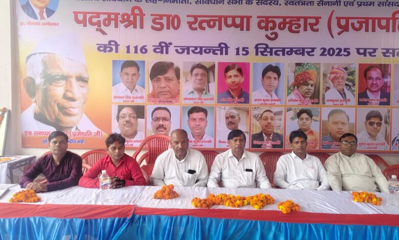 अलीगढ़। राष्ट्रीय प्रजापति सेना ने सोमवार को प्रजापति टावर, चौराहा महेंद्र नगर में पद्मश्री डॉ. रत्नप्पा कुम्हार (प्रजापति) की जयंती मनाई। राष्ट्रीय अध्यक्ष वीरपाल सिंह विधायक ने कहा कि डॉ. रत्नप्पा शोषित, वंचिता, उपेक्षितों के महानायक एवं प्रजापति समाज के कुलभूषण थे। उनका शिक्षा के क्षेत्र में बहुत बड़ा योगदान है। संगठन संरक्षक प्रेमपाल सिंह प्रजापति, गंगा सिंह प्रजापति, दिनेश प्रजापति, अशोक प्रजापति, गजेन्द्र कुमार वर्मा, आचार्य भोजराज सिंह आदि थे।