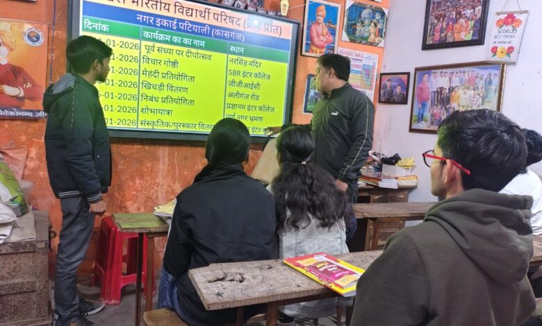 पटियाली अखिल भारतीय विद्यार्थी परिषद नगर इकाई पटियाली की साप्ताहिक कार्ययोजना बैठक मोहल्ला कटरा राजा साहब स्थित परिषद कार्यालय पर सम्पन्न हुई जिसमें मुख्य रूप से विभाग प्रमुख प्रांत सह संपर्क प्रमुख सौरभ दीक्षित व तहसील संयोजक अम्बुज द्विवेदी की मौजूदगी में सम्पन्न हुई ! जिसमें 12 जनवरी युवा दिवस पर आयोजित होने वाले युवा पखवाड़े के अंतर्गत साप्ताहिक कार्ययोजना बनाई जिसमें 11 से 17 जनवरी तक के कार्यक्रमों की योजना बनाई गई जिसमें दीपोत्सव कार्यक्रम, मेहंदी प्रतियोगिता, भाषण प्रतियोगिता, खिचड़ी वितरण, शोभायात्रा, सांस्कृतिक कार्यक्रम, विचार गोष्ठी, एवं पुरस्कार वितरण समारोह आदि कार्यक्रमों की योजना बनाई गई इसी दौरान बदायूं में सम्पन्न हुए 27 से 30 दिसम्बर 2025 को प्रांत अधिवेशन में पटियाली नगर के सौरभ दीक्षित को विभाग प्रमुख के साथ ही प्रांत सह संपर्क प्रमुख नवीन जिम्मेदारी मिलने पर अधिवेशन से लौटने के उपरांत नगर इकाई के कार्यकर्ताओं ने मिष्ठान एवं पुष्प माला पहनाकर सम्मानित किया इस दौरान प्रांत सह संपर्क प्रमुख विभाग प्रमुख सौरभ दीक्षित, तहसील संयोजक अम्बुज द्विवेदी, नगर अध्यक्ष चंद्र देव दीक्षित, सह नगर मंत्री बहन स्नेहा गोस्वामी, सोशल मीडिया संयोजक अंशुल मिश्रा, प्रांत कार्यकारणी सदस्य रोहित पुंढीर, नगर कार्यवाह भास्कर मिश्रा, अनीश दीक्षित, शुभम दीक्षित, पूर्व नगर मंत्री रोशन शर्मा, पुष्पेंद्र कार्यकर्ता पदाधिकारी मौजूद रहें!